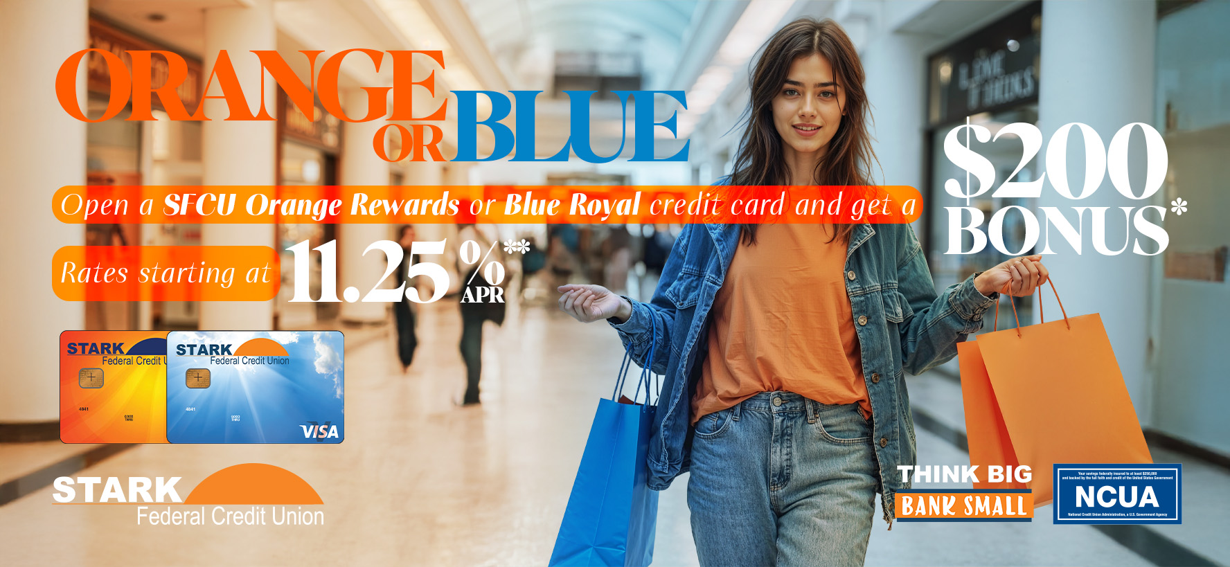 *$200 bonus credit will be applied to the credit card and must be used within a six-month period or will be forfeited. **APR = Annual Percentage Rate. APR is determined when you open your account and is based upon your creditworthiness and substantial credit. The APR will vary with the market based on the Prime Rate plus a margin. The rate is the same for balance transfers and cash advances. No annual fee or minimum finance charge fees. Balance transfer fee is $10. Interest accrues at the time of transfer. SFCU loans are subject to credit approval. Standard rates apply for new purchases. Promotion valid on SFCU VISA Royal Credit Card and SFCU VISA Orange Rewards Credit Card. The standard variable APR is between 11.25% and 17.99% APR for our VISA Royal Credit Card and 16.25% APR for our VISA Orange Rewards Credit Card. Card holders must be current on their payments and meet standard guidelines for credit increase approval. This offer cannot be combined with any other promotional offer. To qualify the Stark Federal member must be 18 years old or older. Current SFCU VISA cardholders are not eligible for this offer. Promotion not valid for organizations and businesses. Other restrictions may apply. Call or visit any branch for more details. Stark Federal reserves the right to cancel or modify the promotion at any time. Offer ends October 31, 2025.