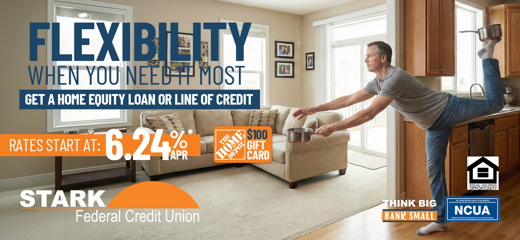 *APR = Annual Percentage Rate. Loans and lines of credit are subject to credit worthiness and membership eligibility. Rates may be different and are based on your personal credit history, loan to value, and term of the loan. Home Equity Line of Credit (Variable Rate): Your home equity contract rate is variable and subject to change monthly based on Wall Street Journal Prime Rate. The rate is based on your creditworthiness, loan to value, and Stark Federal Credit Union's lending policies. Rate are as low as Prime minus .51%. Your rate will vary but never exceed 18.00% APR and never fall below 5.00%. Monthly Payments will be $100 or 1% of the HELOC balance, whichever is greater. Annual fee is $60. Home Equity Loan (Fixed Rate): Fixed rate options allow you to borrow up to 100% of the appraised value of your home, minus your outstanding mortgage balance. Stated rate above is available for loan amounts over $5,000 for 0-60 months and less than 80% loan to value. Sample payment: If you borrow $25,000 secured by an owner-occupied home, for 60 months at 6.24% APR, the monthly payment would be approximately $486.05. **Stark Federal Credit Union will give a $100 Home Depot gift card to everyone who is approved and takes an initial draw of $10,000 or greater on a Home Equity Loan or Home Equity Line of Credit. Offer ends on May 31, 2026