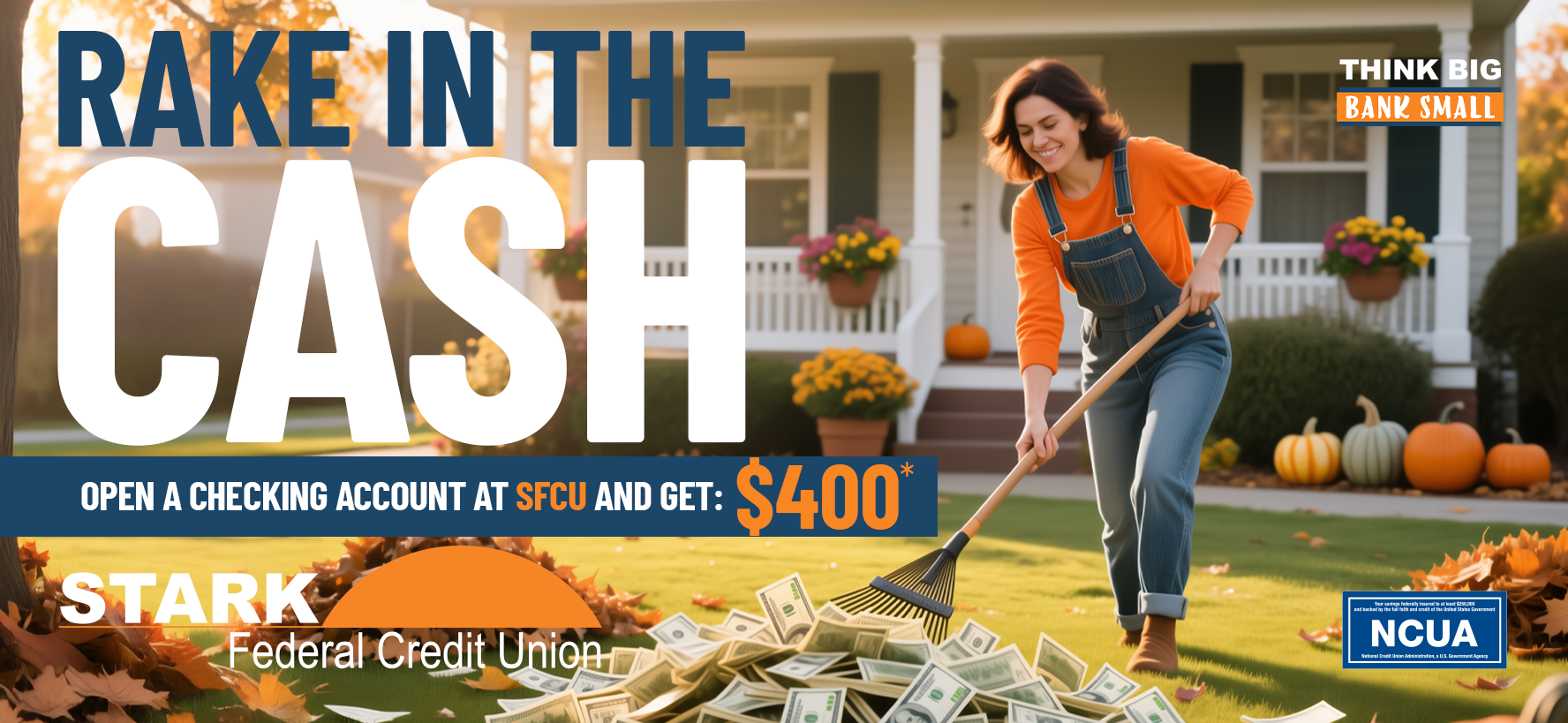 *$400 bonus will be paid via deposit into the checking account of the qualifying member during the 60-day promotional period. To qualify, the Stark Federal member must be 18 years of age or older. Promotion is not valid for organizations and businesses. The member must perform 15 point-of-sale debit card transactions or have direct deposits totaling at least $1,000 within 60 days of opening their new account to qualify. Only first-time SFCU checking account holders are eligible for this promotion. Bonus may appear on a 1099 tax form; Member is responsible for paying all taxes associated with the reward. This offer cannot be combined with any other promotional offer. Stark Federal reserves the right to cancel or modify the promotion at any time. Offer is valid until November 30, 2025.