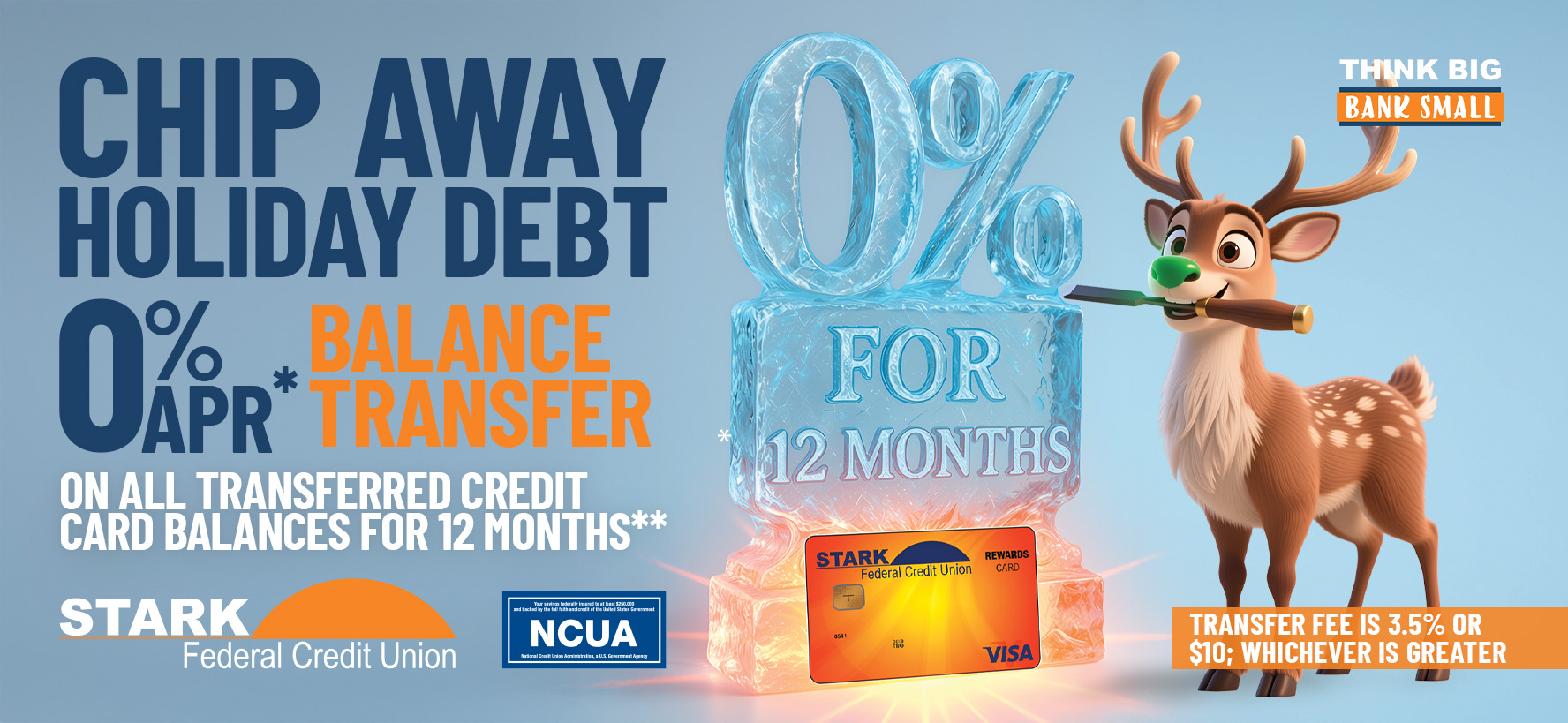 *APR= ANNUAL PERCENTAGE RATE. **SFCU LOANS ARE SUBJECT TO CREDIT APPROVAL. BALANCE TRANSFER FEE IS 3.5% OR $10, WHICHEVER IS GREATER. STANDARD RATES APPLY FOR NEW PURCHASES. BALANCE TRANSFER PROMOTION VALID ON SFCU VISA ORANGE REWARDS CARD AND SFCU VISA ROYAL CARD. LENGTH OF PROMOTIONAL PERIOD WILL BE 0% APR FOR 12 BILLING CYCLES FROM DATE OF LAST BALANCE TRANSFER. PROMOTION APR AVAILABLE FOR NEW BALANCE TRANSFERS ONLY AND APPLIES TO TRANSFERS MADE BETWEEN DECEMBER 1, 2025 - FEBRUARY 27, 2026. AFTER THE PROMOTIONAL PERIOD ENDS, THE STANDARD FIXED APR WILL BE APPLIED TO UNPAID PROMOTIONAL BALANCES. THE STANDARD FIXED APR FOR OUR VISA ORANGE REWARDS CARD IS CURRENTLY 16.00% APR, AND THE APR RANGE FOR THE VISA BLUE ROYAL CARD IS CURRENTLY BETWEEN 11.00%-17.99%. APR IS DETERMINED WHEN YOU OPEN YOUR ACCOUNT AND IS BASED UPON YOUR CREDITWORTHINESS. AFTER THAT, YOUR APR WILL VARY WITH THE MARKET BASED ON THE PRIME RATE PLUS A MARGIN. CARD HOLDERS MUST BE CURRENT ON THEIR PAYMENTS AND MEET STANDARD GUIDELINES FOR CREDIT INCREASE APPROVAL. OTHER RESTRICTIONS MAY APPLY. STARK FEDERAL RESERVES THE RIGHT TO CANCEL THIS OFFER AT ANY TIME. THIS OFFER CANNOT BE COMBINED WITH ANY OTHER PROMOTIONAL OFFER. OFFER EXPIRES FEBRUARY 27, 2026.